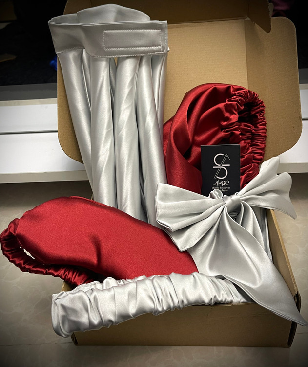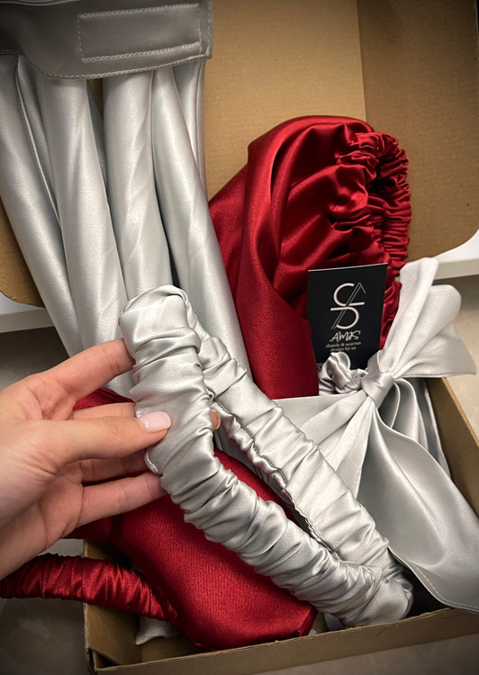پک هدیه زنانه ساتن زرشکی نقره ای مدل V004 ❤️🩶 ( مناسب ولنتاین )